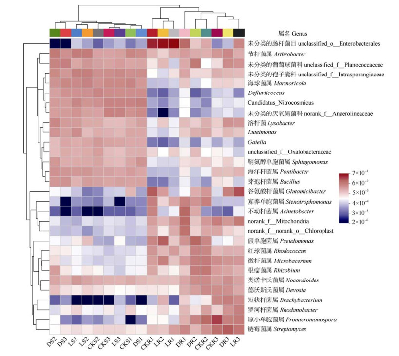 注:CK:不接菌对照处理;D:接灭活菌处理;L:接活菌处理;S:根际土壤细菌群落;R:根内生细菌群落;1:拔节期;2:孕穗期;3:成熟期。 Note: CK, control treatment without strain inoculation; D, inoculation with dead bacterial strain; L, inoculation with live bacterial strain; S, rhizospheric bacterial community; R, root endophytic bacterial community; 1, jointing stage; 2, booting stage; 3, maturity stage. 图 6 属水平细菌群落结构热图 Fig. 6 Heatmap of bacterial communities under different treatments at different growth stages on the level of genus |