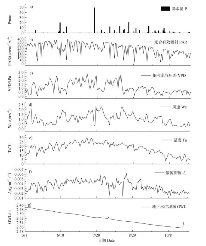 2 结果 2.1 生长季内气象因子与樟子松液流密度变化特征观测期内Ws、PAR、Ta和VPD日变化总体均呈现先波动上升后下降的趋势(图 1)。生长季(5–10月)内平均Ws为1.1 m·s–1,其中5月和10月Ws较低,最低日均Ws为0.5 m·s–1;7–8月较高,最高日均Ws为2.4 m·s–1。观测期内总降雨量为178 mm,其中7–9月降水事件相对集中(共161 mm),占生长季内降雨量的90%,单次最大降雨量为49 mm。PAR生长季内波动明显,其中5、6月整体偏高(介于100~380 μm·m–2·s–1之间),7月之后呈波动下降趋势。生长季内VPD变化范围介于0~2.5 kPa之间(图 1c),其中5–6月和9–10月VPD均值(1.3 kPa和0.7 kPa)显著低于7–8月(1.4 kPa)(P < 0.05)。观测期间平均气温为18.5 ℃,最高温出现在7月(29.7 ℃)(图 1e)。樟子松Js季节变化显著,其中最高值出现在8月,且该月Js变化幅度明显高于其他月份(图 1f)。地下水位埋深变化范围为2.47~2.56 m,其中最深地下水位出现在10月(图 1g)。