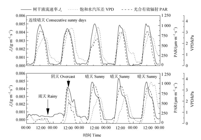 图 2 不同天气条件下液流密度动态变化 Fig. 2 Dynamic changes of sap flow density in different climatic conditions |