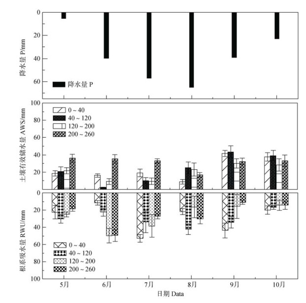图 4 降水量、不同土层土壤有效储水量和根系吸水量动态变化 Fig. 4 Dynamic changes in precipitation, available water storage in different soil layers and root water uptake |
