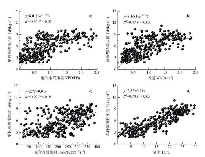 图 5 樟子松单株蒸腾耗水量(Td)与气象因子关系 Fig. 5 Relationships between the transpiration water consumption of single P. sylvestris (Td) and meteorological factors |