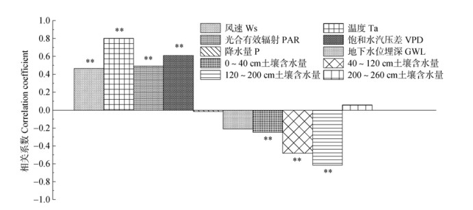 3.2 土壤含水量和地下水位波动对樟子松蒸腾耗水量的影响干旱半干旱地区土壤含水量是影响植物蒸腾耗水特征的重要环境因子之一[6,26]。本研究表明不同土层土壤含水量对樟子松蒸腾耗水的影响存在差异。深层(120~200 cm)土壤含水量对樟子松蒸腾耗水量影响更为显著,0~40和200~260 cm土壤含水量相对较弱(图 6)。这主要归因于:(1)200~260 cm土层接近地下水位,受地下水位季节性波动影响显著,水源供给相对稳定;(2)旱季樟子松主要吸收120~200和200~260 cm土层土壤水,而雨季则主要利用0~40 cm土壤水[19]。此外,樟子松根系功能二态性也为旱季和雨季吸收利用不同深度土壤水提供了有利条件[16]。樟子松单株蒸腾耗水量与Ws、Ta、VPD及PAR呈正相关性,与P、GWL及各土层含水量呈负相关性(图 7)。从日尺度上看,樟子松液流密度动态与地下水位变化趋势相反。白天樟子松蒸腾消耗地下水,导致地下水位短暂下降;夜间樟子松蒸腾作用较弱,地下水位回升(图 3b)。因此研究区地下水位变化可能受到地下水补给途径和植物蒸腾耗水的共同影响[29]。张晓等[12]研究了不同林龄樟子松人工林径向生长对气候及地下水位变化的响应。结果表明,樟子松蒸腾耗水总体上与降水主导的水文年际变化趋势一致,也与地下水位的年际变化规律基本吻合。因此,研究区地下水作为樟子松蒸腾耗水重要的水分来源之一,对维持人工林健康稳定具有至关重要的作用。