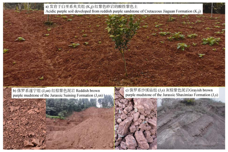 图 1 本研究中所采集的酸性紫色土和两种钙质紫色泥岩照片 Fig. 1 The photos of tested acidic purple soils and two kinds of purple mudstones |