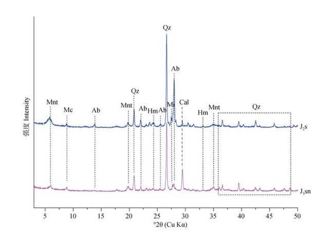 注:Mnt:蒙脱石;Mc:云母;Ab:钠长石;Qz:石英;Mi:微斜长石;Cal:方解石;Hm:赤铁矿。 Note: Mnt: Montmorillonite; Mc: Mica; Ab: Albite; Qz: Quartz; Mi: Microcline; Cal: Calcite; Hm: Hematite. 图 2 两种钙质紫色泥岩的XRD图谱 Fig. 2 XRD spectrum of two kinds of calcareous purple mudstones |