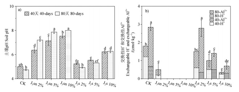 注:CK为空白对照处理,J3sn 2%为添加2%的J3sn泥岩处理,J3sn 5%为添加5%的J3sn泥岩处理,J3sn 10%为添加10%的J3sn泥岩处理,J2s 2%为添加2%的J2s泥岩处理,J2s 5%为添加5%的J2s泥岩处理,J2s 10%为添加10%的J2s泥岩处理。图中不同字母表示不同处理之间差异显著(P < 0.05)。b中的方差分析为交换性酸的差异性分析。 Note: CK was the control treatment. J3sn 2%, J3sn 5%, and J3sn 10% were the treatments with the addition of J3sn mudstones to acidic purple soil at rates of 2%, 5%, and 10%. J2s 2%, J2s 5%, and J2s 10% were the treatments with the addition of J2s mudstones to acidic purple soil at rates of 2%, 5%, and 10%. Different letters in this figure indicate significant differences at P < 0.05. In Fig. 3b, the letters indicate the variance analysis of exchangeable acidity. 图 3 施入两种紫色泥岩改良后酸性紫色土的pH和交换性酸含量 Fig. 3 The pH and exchangeable acidity of acidic purple soil after incubation with purple mudstones |