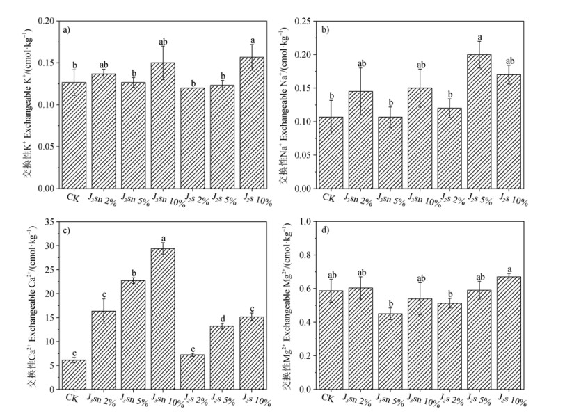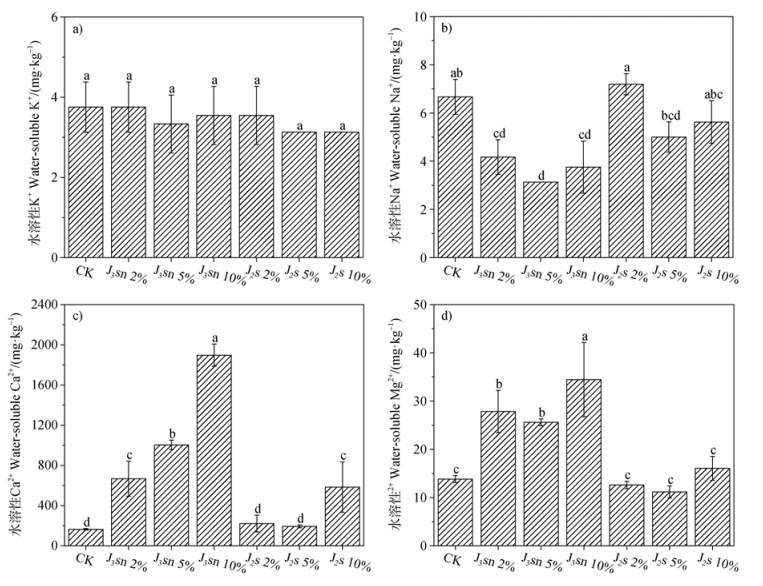 施入两种钙质紫色泥岩后,除降低土壤活性和潜性酸度外,还提高了土壤的交换性盐基离子含量,其中以交换性Ca2+的增加最为显著(图 4)。与空白处理相比,施入不同量的J3sn泥岩培养80 d后,紫色土的交换性盐基总量提高了9.64~23.27 cmol·kg–1,其中交换性Ca2+的增幅达10.24~23.26 cmol·kg–1。而添加2%、5%和10%的J2s泥岩培养后,紫色土的交换性盐基总量从空白处理的6.92 cmol·kg–1分别提高至7.99、14.13和16.11 cmol·kg–1,增幅为1.07~9.19 cmol·kg–1,其中交换性Ca2+增加了1.10~9.03 cmol·kg–1。由于土壤中盐基离子占阳离子交换量的绝大部分,施入钙质紫色泥岩后土壤交换性酸降低明显,但交换性Ca2+的含量随钙质泥岩用量的增加有极显著的提高,最终测得的土壤有效阳离子交换量(ECEC)随紫色泥岩用量的增加而增加(图 5)。两种紫色泥岩在相同用量条件下,J3sn泥岩对酸性紫色土交换性Ca2+、交换性盐基总量和ECEC的提高程度均明显优于J2s泥岩。尽管水溶性盐基离子含量远低于交换性盐基离子的含量,但两者处于一种动态的平衡关系,因此添加紫色泥岩对紫色土水溶性盐基离子的含量也有一定程度的改变(图 6)。其中,施用J3sn泥岩改良后紫色土的水溶性Ca2+提升效果最为明显,2%、5%和10%添加量处理下的土壤水溶性Ca2+含量分别为空白处理的4.07倍、6.16倍及10.43倍。