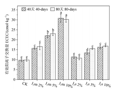 图 5 施入两种紫色泥岩改良后酸性紫色土的有效阳离子交换量 Fig. 5 Effective cation exchange capacity of acidic purple soil after incubation with purple mudstones |