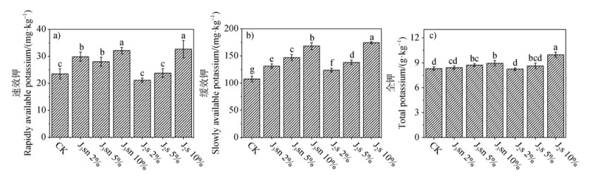 2.3 土壤的钾素含量变化紫色泥岩的矿质养分元素含量丰富,这也是为何在紫色土丘陵区,尽管部分紫色土的土层浅薄、粗骨性强,但仍被开发利用,成为重要的农耕土壤。两种紫色泥岩的全钾含量均在2%以上的丰富水平,添加钙质泥岩培养80 d后酸性紫色土的速效钾、缓效钾和全钾含量如图 7所示。尽管各处理间的土壤水溶性钾含量并无显著变化(图 6),但土壤的速效钾、缓效钾和全钾含量整体表现出随着两种钙质泥岩用量的增加而增加(图 7)。施入紫色泥岩后,紫色土的速效钾和缓效钾含量均显著高于空白处理。在10%用量条件下,施用J3sn泥岩和J2s泥岩后紫色土的速效钾含量从空白处理的23.5 mg·kg–1分别提高至32.2和32.7 mg·kg–1。空白处理的土壤缓效钾含量为107.7 mg·kg–1,添加2%、5%和10%的J3sn泥岩培养后分别提高了22.0%、36.5%和56.2%,添加2%、5%和10%的J2s泥岩培养后分别提高了15.0%、28.2%和62.0%。当J3sn泥岩的用量大于5%,J2s泥岩的用量大于10%,被改良紫色土的全钾含量显著高于空白处理。土壤速效钾和缓效钾之和为土壤有效钾,是土壤在一定时期内能被植物吸收利用的钾素。土壤中的钾素主要以无机形态存在,其中绝大部分是以植物难以吸收利用的矿质态钾存在,所以土壤有效钾占全钾的比例一般较低。培养80 d后,空白处理土壤有效钾占全钾的百分比为1.58%,添加2%、5%和10%的J3sn泥岩培养后的土壤有效钾占比分别为1.91%、2.01%和2.24%,添加2%、5%和10%的J2s泥岩培养后的土壤有效钾占比分别为1.76%、1.88%和2.08%。所以,施入钙质泥岩能提高土壤中各形态钾素的含量及其生物有效性,其中J3sn泥岩对紫色土钾素有效性的提升效果优于J2s泥岩。