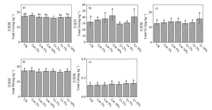 2.4 土壤的重金属含量的变化图 8所示的是施入两种紫色泥岩培养80 d后紫色土的全量重金属含量。空白处理土壤的Cu、Zn、Ni、Pb、Cd等5种重金属含量分别为17.5、32.6、12.6、17.3、0.12 mg·kg–1,其中土壤的全Zn、Ni含量低于两种紫色泥岩,全Cd含量略高于两种紫色泥岩,全Cu和全Pb含量与J2s泥岩接近,但高于J3sn泥岩。受紫色泥岩和酸性紫色土全量重金属含量差异的影响,土壤全Zn和全Ni含量随泥岩用量的增加而略有升高,土壤全Cd和全Pb含量无明显变化规律,土壤全Cu含量随J3sn泥岩用量的增加而降低,土壤全Cu含量随J2s泥岩的添加有所上升。但除土壤全Cu含量的部分处理间存在显著性差异外,土壤中其余重金属含量的处理间差异不显著。各处理土壤中的重金属含量均未超过农用地土壤污染风险筛选值。所以,添加紫色泥岩对酸性紫色土重金属的含量无明显影响。