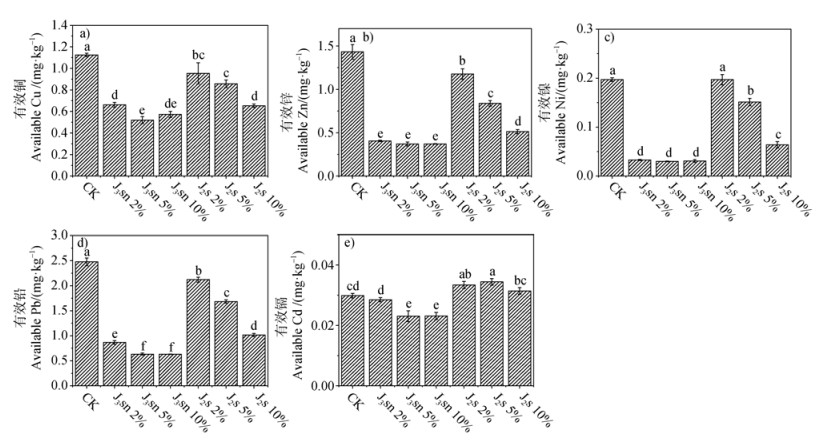 值得注意的是,添加紫色泥岩显著地降低了有效态重金属的含量。随着两种紫色泥岩用量的增加,土壤中5种重金属的有效态含量呈现出明显的降低趋势(图 9)。添加J3sn泥岩对土壤重金属有效态的降低程度明显优于J2s泥岩,在较低用量时便可使土壤有效重金属含量大幅降低。如J3sn泥岩在2%添加量时,土壤中有效Zn和Ni的含量较空白处理降幅达72%和83%,后续随着J3sn泥岩用量的增加不再显著降低。进一步计算得到改良后土壤中有效态重金属占全量重金属的比例(表 3)。可以看出,随着两种紫色泥岩用量的增加,土壤中5种重金属的有效态占全量的比例均逐渐降低。在相同用量条件下,J3sn泥岩处理土壤的重金属有效态占其全量的比例均低于J2s泥岩处理,J3sn泥岩降低酸性紫色土重金属活性的效果更好。
