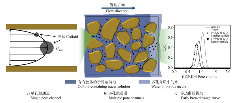 1 胶体在多孔介质中运移的尺寸排阻机制沉积、物理阻塞、堵塞、熟化、聚集和尺寸排阻等过程是目前公认的胶体在多孔介质中运移时所发生的主要机制[29-31]。沉积是胶体在固液界面发生的转移,物理阻塞则是胶体在两个及以上固液界面发生的拦截,这两个过程是胶体滞留在多孔介质中的主要机制[32-33]。堵塞的产生是因为介质表面对于胶体的附着具有有限的点位,一旦这个点位被填满,先前附着的胶体就会阻碍后来胶体的附着。熟化与堵塞相反,胶体与胶体间的相互作用较胶体与介质表面的相互作用更强,先前吸附在介质表面的胶体可以作为新的位点提供给后来的胶体附着。聚集是胶体尺寸增加的过程,其会改变胶体的运移特性,影响与尺寸相关的动力学过程。例如,较小的胶体聚集会促进胶体聚集体尺寸的变大,从而增加尺寸排阻的可能性,同时还可能发生物理化学滞留和通过阻塞引起的滞留[34]。尺寸排阻是较大颗粒胶体的运移速度快于小颗粒胶体和保守性溶质的现象(其本质是取决于胶体尺寸和孔径的比值)。与前面提到的运移机制不同,尺寸排阻大多被认为是胶体运移的增强机制,会促进胶体的运移[21]。