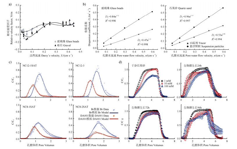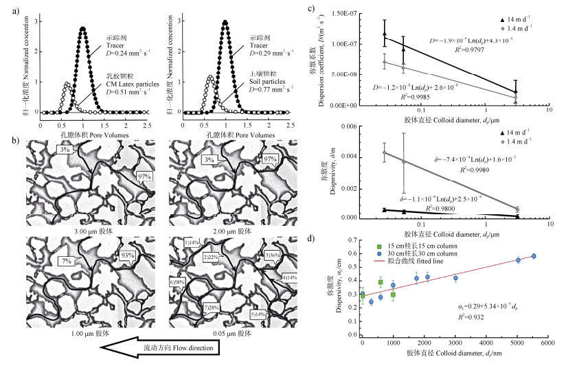 2.1 胶体性质的影响胶体类型、表面电荷、表面粗糙度和形状尺寸等性质是影响其在多孔介质中运移尺寸排阻效应的重要因素。在胶体类型方面,Kretzschmar等[46]在砂土介质中分别注入了乳胶胶体和具有腐殖质涂层的针铁矿胶体,两种胶体穿透曲线均显示出早期穿透现象,但它们的穿透行为存在差异。Grolimund等[47]在柱迁移试验中测试了直径相似的乳胶胶体和土壤胶体的运移特性,结果显示两种胶体均表现出尺寸排阻效应,其移动速度较保守示踪剂(NO3–)快大约1.45倍,且土壤颗粒的弥散系数更大(图 2a)。Weisbrod等[48]在岩心中的迁移试验发现,胶体颗粒早于保守示踪剂(Br–和Li+)穿出,其中噬菌体T4的到达时间为4.7 min,而同样大小的200 nm荧光乳胶微球到达时间为5 min。在胶体形状方面,You等[49]比较了多个噬菌体在土柱中的迁移行为,结果表明,粒径相近的三种噬菌体PSA-HM1(173 nm)、PSA-HS2(210 nm)和T4(203 nm)先于保守示踪剂Br–穿透,三种噬菌体相对于Br–的穿透时间缩短了31%~65%,这可能是因为不同的噬菌体的尾部不同。在胶体尺寸方面,Sirivithayapakorn和Keller[50]通过微观模型试验直接观测胶体的运移速度与轨迹,发现相较于保守性溶质,胶体运移速度提高了4倍~4.5倍,且胶体粒径越大,路径越简单,弥散性越低(图 2b)。随后Keller和Sirivithayapakorn[51]在柱试验中得到了与微观模型试验一致的结果,胶体(MS2和聚苯乙烯微球)早于保守示踪剂(KCl)穿出,胶体的弥散性较保守示踪剂更低,胶体的弥散系数和弥散度随其粒径增大而减小(图 2c)。但Chrysikopoulos和Katzourakis[37]的研究得出了不同结果,他们的柱试验结果表明,与保守示踪剂相比,胶体(荧光聚苯乙烯微球)的弥散度更大,并随着胶体粒径的增加而增加(图 2d)。他们认为这是胶体在多孔介质中运移所受两种机制拮抗作用的结果,即胶体在流线中央快速区域移动会导致其弥散度减小,而具有大尺寸的胶体只能通过部分较大孔隙,会导致其弥散度增加,这两种效应的强弱最终决定了胶体的弥散度。