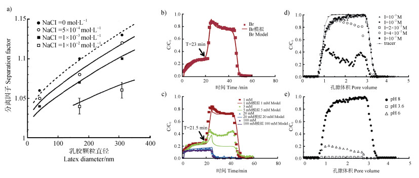 溶液类型、离子浓度和pH等背景溶液性质通过改变胶体的聚集-分散动力学行为、介质表面阳离子交换以及胶体与介质之间的静电力等来影响胶体在多孔介质中运移的尺寸排阻效应[56]。在溶液类型方面,Shen等[57]研究了不同阳离子类型(Na+和Ca2+)组成对乳胶胶体(30和1156 nm)在玻璃珠介质中运移行为的影响后发现,Ca2+可以通过桥键作用将胶体吸附在固相颗粒表面而减弱胶体的运移能力。这一结论得到了Chen等[58]和Wang等[59]研究结论的支持,他们分别比较了松木屑生物炭胶体和小麦秸秆生物炭胶体在两种背景溶液(Na+和Ca2+)下的运移规律,发现Ca2+溶液具有更高的电荷屏蔽效应和阳离子桥接作用,其对胶体运移能力的抑制作用明显强于Na+溶液,促进了胶体在介质上的附着。在离子浓度方面,Nagasaki等[60]发现乳胶颗粒在石英砂介质中的分离因子(乳胶颗粒和氚水的平均速度之比)不仅随着胶体粒径的增加而增加,而且随着NaCl浓度的降低而增加(图 4a)。类似的现象在无机胶体和生物胶体的研究中也被证实,邵珍珍等[61]研究发现高离子浓度下二氧化硅胶体出流量很小,而低离子浓度时胶体全部或部分出流。Wang等[62]的研究也表明在低离子浓度时(1 mM)大肠杆菌(1.84 μm)会早于保守示踪剂1.5 min穿出石英砂介质,表现出明显的尺寸排阻现象(图 4b和图 4c)。然而,胶体在高离子浓度溶液中也并非只表现出运移受阻。Solovitch等[63]的研究发现小粒径胶体(150 nm)在砂柱中运移时与保守示踪剂没有明显区别,但在高离子浓度(20 mM)中会聚集成较大颗粒,此时通过砂柱后表现出尺寸排阻效应(图 4d)。研究认为,高离子强度首先促进胶体的聚集,增加颗粒的沉积,然后沉积在介质表面的颗粒会改变柱中的孔隙结构,没有沉积的聚集体会更快地从介质中穿出,从而发生尺寸排阻现象。溶液的pH可以通过改变胶体和固相颗粒的表面电荷量来影响胶体在多孔介质中的运移行为。Schulze-Makuch等[64]发现,在碱性条件(pH为8.1)下,噬菌体MS2在含水层介质中的运移速度快于Br–,而在中性和酸性条件(pH为7.5和6.1)下,MS2的运移速度则减慢。类似地,Walshe等[65]的研究也表明,随着pH的升高(pH从6到7.5),MS2相较于Br–更早穿透介质的现象变得更加显著。孙慧敏等[66]的研究发现,高岭石胶体在石英砂柱中的穿透曲线在不同pH条件下(pH从3.75到9.40)差异明显,酸性条件下(pH为3.86)会显著阻碍高岭石的迁移,而不同pH条件对蒙脱石胶体运移基本无影响,这是由于不同类型胶体表面所带电荷性质决定的。Solovitch等[63]的研究则发现,在pH为6时,TiO2胶体从柱中穿透的速度较pH为8时更快(图 4e)。