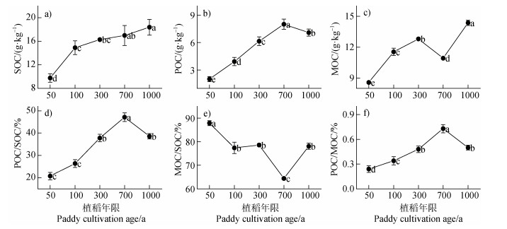 2 结果 2.1 不同植稻年限土壤有机碳含量及其组分变化长期植稻下土壤有机碳显著积累,在最初的100年间有机碳快速提高,100年后积累速度放缓并在1 000年时达到最大值(18.4 g·kg–1)(图 2a)。虽然POC和MOC的含量随植稻年限均表现出不同程度的增加趋势,但两者在土壤有机碳中占比的变化趋势却截然相反。土壤颗粒有机碳(POC)含量由最初的2.0 g·kg–1增长至1 000年时的7.1 g·kg–1,占有机碳的比例由20.7%增加至38.6%(图 2b,图 2d)。矿物结合态有机碳(MOC)含量虽在700年时有所降低,但仍在植稻1 000年升至14.4 g·kg–1;其占有机碳的比例随时间呈现波动式下降,由植稻50年的87.9%下降至1 000年的78.1%(图 2c,图 2e)。随植稻年限的增长,POC/MOC整体呈上升趋势,但在700年达到最大值0.7(图 2f)。