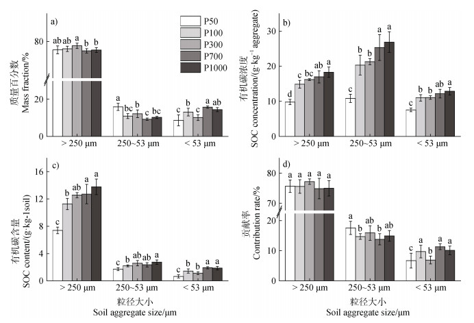 1.3 土壤团聚体分级及其有机碳密度分组原状土壤样品经过自然风干,清除砾石和可见的植物碎屑后,利用自动振荡筛(Endecotts Minor 200,英国)结合最佳含水量法进行力稳性团聚体分级[16],最终分为三级:> 250 μm(大团聚体)、250~53 μm(微团聚体)和 < 53 μm(黏粉粒级微团聚体)。