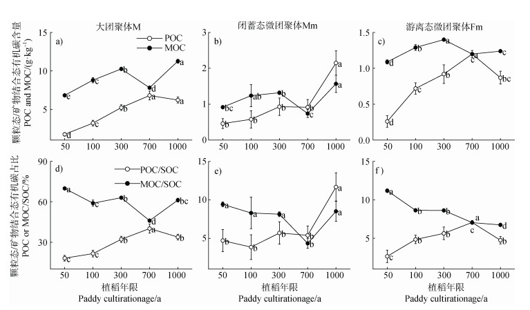 3.2 长期植稻下土壤闭蓄态和游离态微团聚体中不同有机碳组分的固持特征不同状态团聚体中MOC含量在植稻300年时均有所下降,而POC含量持续增加(图 4a, 图 4b, 图 4c),可能是因为团聚体中的MOC含量趋于饱和状态[23]。700年后大团聚体内POC含量有下降趋势,POC/MOC随植稻时间呈先增加后降低的趋势。这主要是因为大团聚体稳定性差,容易被破坏而导致其内部保护的POC分解[24]。