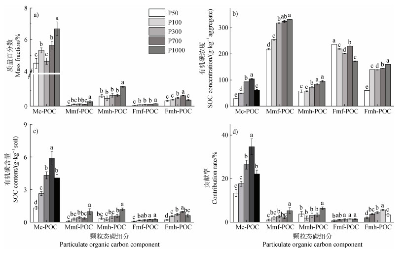 注:网格状表示闭蓄态微团聚体碳组分,斜线表示游离态微团聚体碳组分。下同。Mc-POC,大团聚体内粗颗粒态有机碳;Mmf-POC,闭蓄态微团聚体轻组颗粒态有机碳;Mmh-POC,闭蓄态微团聚体重组颗粒态有机碳;Fmf-POC,游离微团聚体轻组颗粒态有机碳;Fmh-POC,游离微团聚体重组颗粒态有机碳。 Note: Grid pattern represents carbon components of occluded microaggregates, oblique lines represents carbon components of free microaggregates. The same as below. Mc-POC, coarse particulate organic carbon inside macroaggregates; Mmf-POC, light fine particulate organic carbon inside occluded microaggregates; Mmh-POC, heavy particulate organic carbon inside occluded microaggregates; Fmf-POC, light fine particulate organic carbon inside free microaggregates; Fmh-POC, heavy particulate organic carbon inside free microaggregates. 图 5 颗粒态有机碳质量比例及其碳含量 Fig. 5 Mass proportion and content of particulate organic carbon |