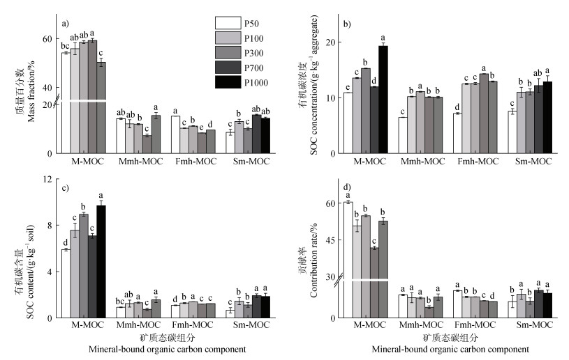 注:M-MOC,大团聚体内矿物结合态有机碳;Mmh-MOC,闭蓄态微团聚体矿物结合态有机碳;Fmh-MOC,游离微团聚体矿物结合态有机碳;Sm-MOC,黏粉粒级微团聚体矿物结合态有机碳。 Note: M-MOC, mineral-bound organic carbon inside macroaggregates; Mmh-MOC, mineral-bound organic carbon inside occluded microaggregates; Fmh-MOC, mineral-bound organic carbon inside free microaggregates; Sm-MOC, mineral-bound organic carbon inside silt-clay microaggregates. 图 6 矿物结合态有机碳质量比例及其碳含量 Fig. 6 Mass proportion and content of mineral-bound organic carbon |