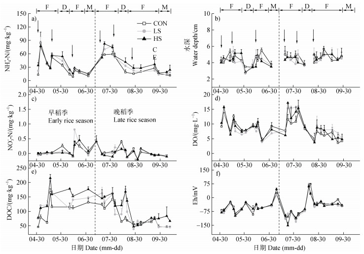 注:F表示淹水期,D表示排水期,M表示收获前落干,箭头表示施加肥料。CON、LS、HS分别表示常规施肥处理、低量秸秆还田处理、高量秸秆还田处理。下同。 Note: F represents the flooding period, D represents the drainage period, M represents pre-harvest drying, arrow represents fertilizer application. CON, LS, and HS denote conventional fertilizer treatment, low amount of straw return treatment, and high amount of straw return treatment, respectively. The same as below. 图 1 2022年早晚稻季田间土壤铵态氮(NH4+-N,a)、田间水深(b)、土壤硝态氮(NO3–-N,c)、田面水溶解氧(DO,d)、土壤溶解性有机碳(DOC,e)和土壤氧化还原电位(Eh,f)变化动态 Fig. 1 Dynamics of changes in soil ammonium nitrogen(NH4+-N, a), field water depth(b), soil nitrate nitrogen(NO3–-N, c), dissolved oxygen of surface water(DO, d), soil dissolved organic carbon(DOC, e), and soil redox potential(Eh, f)in the field during the early and late rice seasons of 2022 |