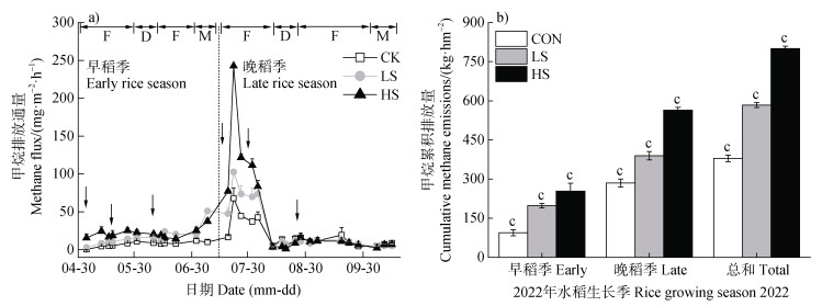在连续秸秆还田第11年的晚稻季,CON、LS和HS三种处理的CH4累积排放量(图 2b)均要显著高于早稻季(P<0.05),CON、LS和HS处理下分别增加了169%、65.2%和110%。LS和HS处理下的CH4累积排放量在早稻季相较于CON处理分别增加了131%和184%,而在晚稻季中,则分别增长了41.7%和121%,均显著(P<0.05)高于CON处理,在晚稻季的秸秆还田处理中HS的累积排放量相比LS增加了56.2%,显著(P<0.05)大于LS处理下的CH4累积排放。在早稻期间,各处理的CH4排放累积量在82.8 ~318 kg·hm–2(以C计,下同)之间变化,在晚稻生育期间,各处理的CH4排放累积量则在268~573 kg·hm–2之间变化。