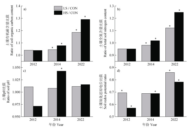 本研究发现秸秆还田能显著增加SOC(图 3a)和TN(图 3b)含量,在2012年,处理间SOC含量无显著差异,而2014年,与CON相比,LS和HS土壤SOC含量分别显著增加了4.6%和7.8%,2022年,SOC含量分别显著增加了18.5%和29.1%(P<0.05)。LS和HS处理的TN含量在秸秆还田第1年和第3年未表现出显著差异,但LS和HS相对CON处理下SOC和TN含量的增幅随年限的增长呈现上升的趋势。各处理间土壤pH的差异(图 3c)随还田年限的变化并不显著,仅在还田第3年,HS处理相对CON增加了4.3%。LS和HS相对CON处理Eh的差异(图 3d)随还田年限的增加整体表现出减小的趋势,在2012年,LS和HS分别相对CON处理减少了30.5%和42.9%,在2022年,该数值变为14.1%和21.8%(P<0.05)。