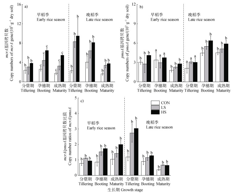 mcrA和pmoA基因分别通过编码甲基辅酶M还原酶将产甲烷底物转化为甲烷,和编码甲烷氧化单加氧酶实现甲烷氧化,且由于其几乎分别存在于所有的产甲烷菌和甲烷氧化菌中,而被广泛运用于CH4相关的研究[16]。本研究中,在秸秆还田第11年水稻生长季,各处理的mcrA基因丰度在早稻季随着水稻生长逐渐增加(图 4a),在成熟期出现降低,在晚稻季会随着水稻的生长保持降低的趋势;整体而言,LS和HS处理的mcrA基因丰度显著大于CON处理,分别增加了96.0%和152%(P<0.05)。各处理的pmoA基因丰度在早稻生长期出现逐渐降低的趋势(图 4b),但在晚稻生长期会保持上升趋势;整体而言,LS和HS处理的pmoA基因丰度与CON处理相比显著增加了12.7%和34.8%(P<0.05)。各处理的mcrA/pmoA丰度比值在早稻生长期呈逐渐上升的变化动态(图 4c),但在晚稻生长期会保持逐渐降低的趋势;整体而言,LS和HS处理的mcrA/pmoA基因丰度比值与CON处理相比,分别增加73.9%和85.8%(P<0.05)。