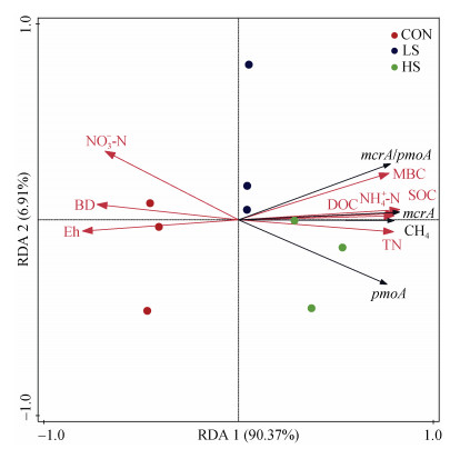 1.4 数据处理与统计分析实验数据的基础处理和计算在Excel 2019中运行。数据分析和作图采用Excel 2019、R 4.2.0和Origin8.1软件共同完成。使用Canoco5对温室气体排放影响因子进行冗余分析。通过SPSS 26进行处理之间的单因素方差分析(最小显著差异法(LSD)检验,统计显著水平为P < 0.05)。用斯皮尔曼(Spearman)等级相关分析方法检验环境因子与响应因子之间的相关关系