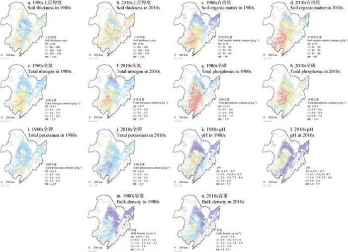 图 2 东北黑土区1980年及2010年耕地土壤性质空间分布 Fig. 2 Spatial distribution of cropland soil properties in the black soil region of Northeast China between 1980 and 2010 |