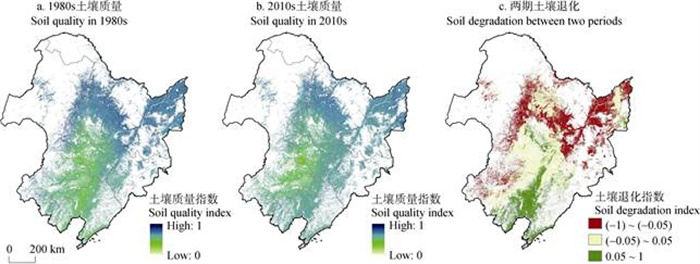 1.5 土壤质量空间反演本文采用随机森林回归模型反演土壤理化性质的空间分布格局。随机森林两个关键参数设置为ntree=500,mtry=22。保持两个时期各指标建模方式一致,基于样点的生物气象指标、昼夜地表温度、植被指数、光谱特征、高程及衍生地形参数、母岩类型等环境变量,建立起土壤理化性质预测模型。模型对于两个时期土壤有机质含量、全氮含量、全磷含量、pH和容重预测R2分别为0.38~0.43、0.27~0.37、0.35~0.38、0.56~0.62及0.25~0.45;对土体厚度(0.20~0.31)和全钾含量预测的R2(0.17~0.21)偏低。以建模时对应的环境因子分布图作为因变量,使用随机森林回归模型进行空间预测。在土地利用类型为耕地的基础上,输出东北黑土区土壤性质分布图,空间分辨率为90 m×90 m。利用各指标图层及权重,使用式(2)进一步计算获得两期土壤质量综合指数空间分布图,记为SQI1980和SQI2010。