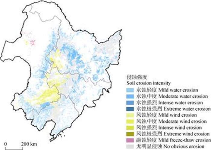 (2)土壤侵蚀数据。使用1997-2000年完成的全国第二次水土流失遥感调查成果,1:10万比例尺分省份土壤侵蚀强度分级图(下载于国家地球系统科学数据中心 https://www.geodata.cn)。