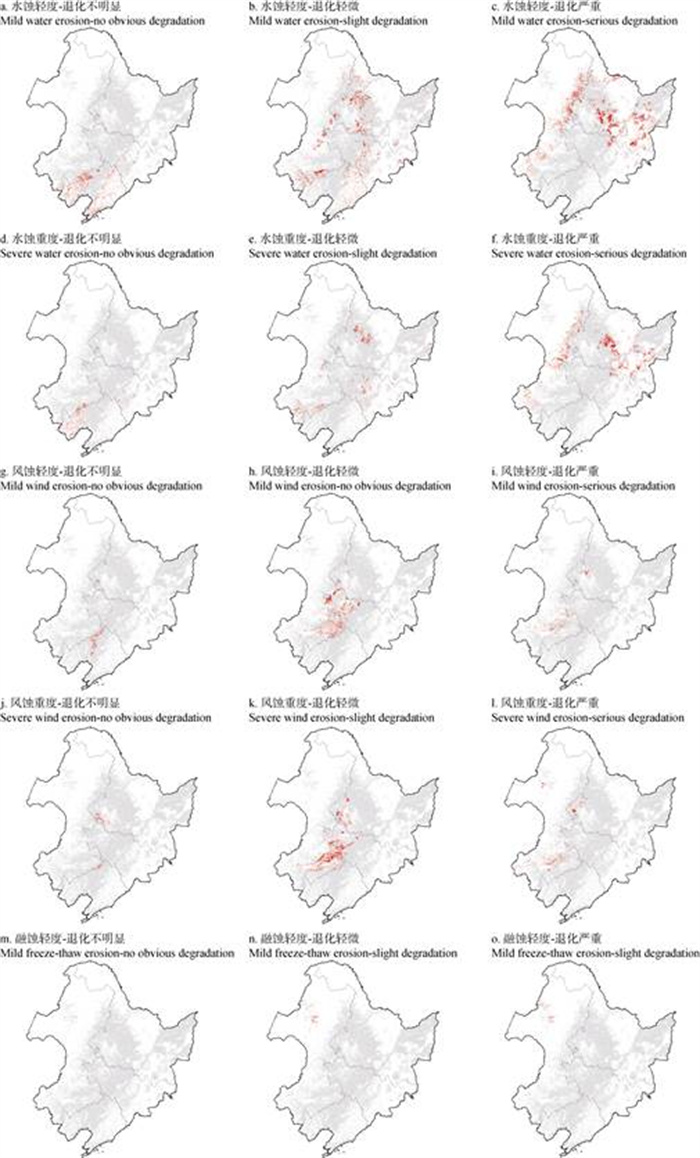 东北黑土区侵蚀退化类型通过叠加土壤侵蚀强度(水蚀轻度、水蚀重度、风蚀轻度、风蚀重度、融蚀轻度)和土壤退化程度(不明显、轻微、严重)所确定,共划分为15种类型。由不同类型空间分布图看出(图 5),东北黑土区侵蚀退化以水蚀轻度-退化严重类型为主,占侵蚀耕地面积的23.7%,分布在大兴安岭东部、小兴安岭北部、松嫩平原南部及长白山北部;其次为水蚀轻度-退化轻微、水蚀重度-退化严重和风蚀重度-退化轻微类型,面积占比分别为16.4%、14.1%和10.1%,分布在大兴安岭东南侧、松嫩平原北部与小兴安岭交汇处至长白山沿线,大兴安岭东北侧、小兴安岭与松嫩平原及长白山交界处,松辽平原中部及科尔沁沙地;部分田块属于风蚀轻度-退化轻微(8.3%)、水蚀轻度-退化不明显(7.4%)和水蚀重度-退化轻微类型(6.8%),同时有少量田块为风蚀重度-退化严重(3.2%)、水蚀重度-退化不明显(3.1%)、风蚀轻度-退化严重(2.3%)、风蚀轻度-退化不明显(1.9%)和风蚀重度-退化不明显(1.3%)类型,3种冻融侵蚀退化类型的面积占比仅为1.4%,分布于大兴安岭西部山麓。综合东北黑土区15种耕地侵蚀退化类型的空间分布,如图 6所示。