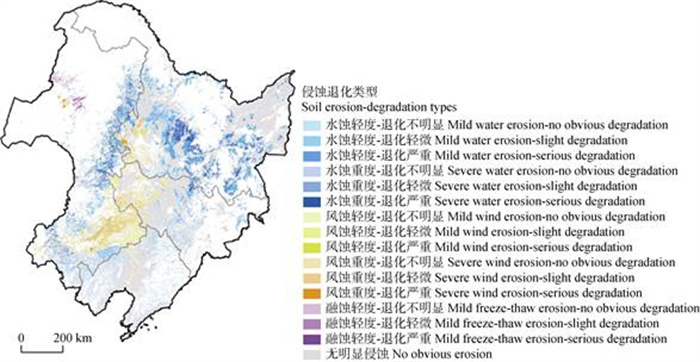 1.8 侵蚀退化分类方法对东北黑土区划分侵蚀退化类型时,划分依据为主要侵蚀营力、土壤侵蚀强度及退化程度,其中侵蚀强度为中度及以上者归纳为重度侵蚀。黑土地侵蚀退化被划分为水蚀轻度-退化不明显、水蚀轻度-退化轻微、水蚀轻度-退化严重;水蚀重度-退化不明显、水蚀重度-退化轻微、水蚀重度-退化严重;风蚀轻度-退化不明显、风蚀轻度-退化轻微、风蚀轻度-退化严重;风蚀重度-退化不明显、风蚀重度-退化轻微、风蚀重度-退化严重;融蚀轻度-退化不明显、融蚀轻度-退化轻微、融蚀轻度-退化严重15种类型。