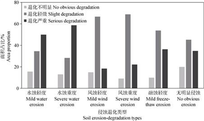 东北黑土地侵蚀类型多样且造成的退化程度不一,在相同侵蚀类型下不同侵蚀强度具有相似的退化程度(图 7)。当存在水蚀轻度和水蚀重度时,耕地退化面积均随退化程度变强而增多。相较于无明显侵蚀耕地,退化不明显和退化轻微耕地的面积占比降低,退化严重的面积占比升高,表明水蚀加剧了耕地退化程度。发生风蚀轻度和风蚀重度时,退化轻微的耕地面积突出,退化不明显和退化严重的耕地面积占比均降低,表明风蚀使得耕地退化向轻微程度集中。发生融蚀轻度退化的耕地面积与无明显侵蚀耕地的规律相似,退化轻微和退化严重的耕地面积较多,退化不明显耕地最少。总体而言,侵蚀类型而非侵蚀强度是影响黑土地退化程度分异的主要因素,其中水蚀导致耕地退化最为严重。