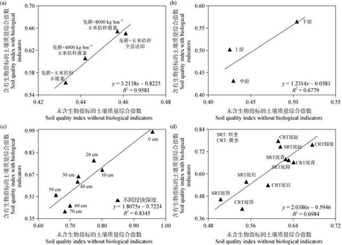 3.3 侵蚀退化评价指标与方法展望由于缺少采样范围全面、长历时可对比的土壤生物数据,本文未能将土壤酶及微生物等相关指标纳入土壤退化评价体系。采用文献研究和以空代时的方法,作者收集了中英文文献及学位论文中有关黑土性质变异的部分数据,通过加入对土壤生物性质的考虑,重新构建了包含生物指标在内的土壤质量综合指数,分别增加包括土壤酶活性[43-44]、土壤微生物数量等指标[45-46]。假设各指标权重一致,从包含和未包含生物指标两方面开展土壤质量评价。结果如图 8所示,两种土壤质量综合指数之间存在高度相关性,决定系数R2分别为0.96、0.68、0.83和0.70。由此可见,基于土壤理化指标所构建的区域尺度黑土质量评价结果具有一定的可信性,但仍需要关注与土壤养分循环密切相关的土壤酶及微生物指标。