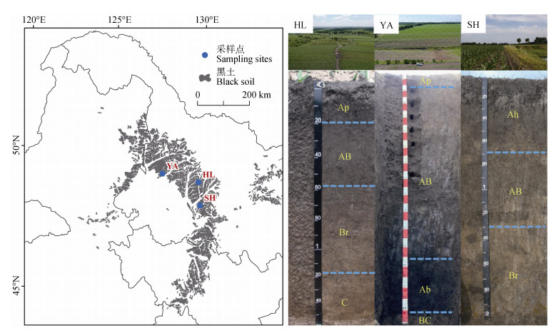 注:图中Ap为耕作层、Ah为腐殖质层、AB为腐殖质层与淀积层过渡层、Ab为腐殖质埋藏层、Br为氧化还原层、BC为淀积层与母质层过渡层、C为母质层。HL、YA、SH为位于海伦、依安、绥化的三个剖面。下同。 Note: Ap is the cultivation layer, Ah is the humus layer, AB is the transitional layer of the humus layer and illuvial layer, Ab is the burial layer of humus, Br is the redox layer, BC is the transitional layer of illuvial layer and parent material, C is the parent material layer. HL, YA, and SH are located in Hailun, Yi'an, and Suihua, respectively. The same as below. 图 1 采样点位置及剖面层次 Fig. 1 Sampling sites and profile layers |