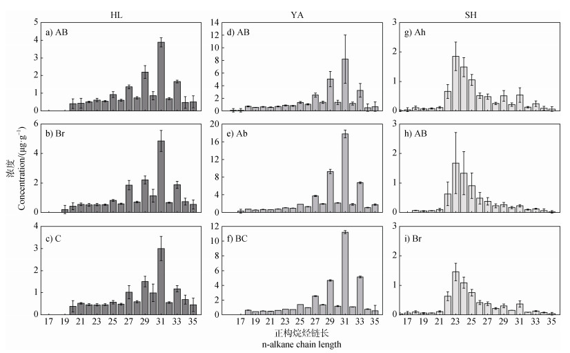 正构烷烃浓度(∑C25~35)为单位质量干重的土壤中正构烷烃C25~C35绝对浓度之和,单位为μg·g–1。