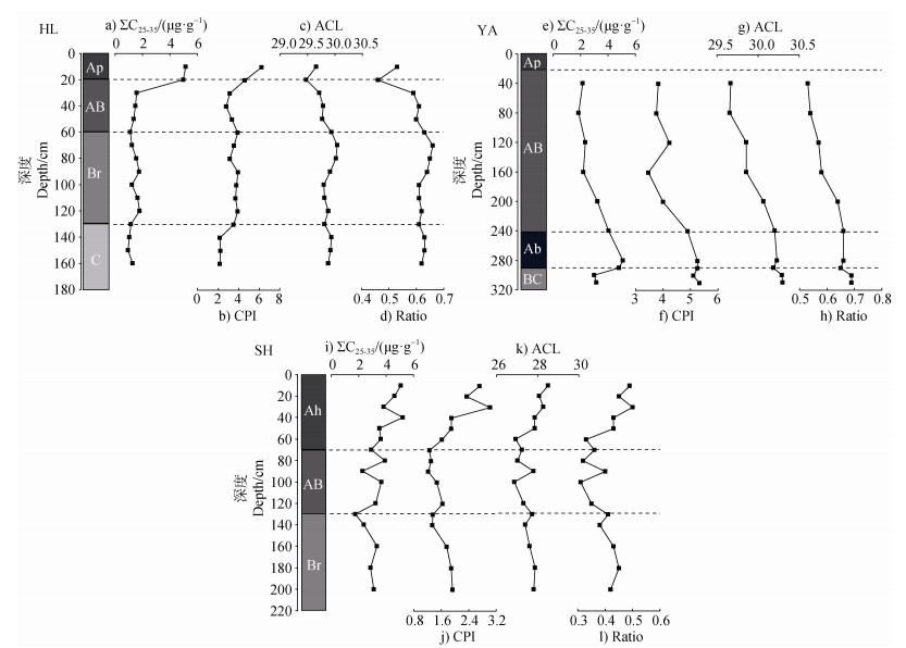 土壤中的长链正构烷烃主要来自高等植物的叶蜡[9,16]。三个剖面的长链正构烷烃浓度及相关参数变化如图 3所示。HL剖面ΣC25~35值自160至30 cm变化较稳定(图 3a),至表层明显增加,达5.2 μg·g–1,说明可提取的游离态正构烷烃在土壤表层富集,而在表层以下趋于稳定。CPI值介于2.2~6.2(图 3b),在母质层稳定在低值,表层有所增加,反映出表层正构烷烃分解程度低、抗分解能力弱,而下部土层游离态正构烷烃分解程度高。ACL和ratio值变化范围分别为29.8~30.4、0.5~0.7,变化趋势均从160~20 cm逐渐降低(图 3c,图 3d)。