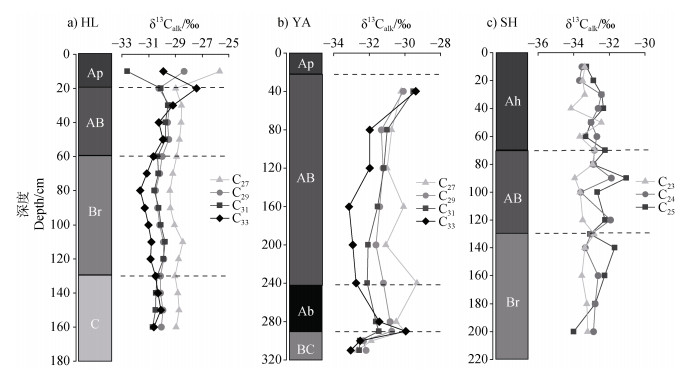 2.3 黑土正构烷烃单体碳同位素分布特征由于3个剖面正构烷烃的浓度均相对较低,因此HL与YA剖面选取测定了含量相对较高的C27、C29、C31和C33这4种化合物的碳同位素组成,同样SH剖面也选取浓度最高的C23、C24、C25。HL与YA剖面整体上δ13Calk值呈C27 > C29 > C31 > C33,且在表层以下不同链长δ13Calk值的变化趋势基本一致。HL剖面在Br层δ13Calk值减少,而在AB层δ13Calk值又增加(图 4a);YA剖面在BC层δ13Calk值偏低,到Ab层δ13Calk值增加,后到AB层δ13Calk值又降低(图 4b);SH剖面整体上同位素值C25 > C24 > C23(图 4c),剖面上有波动但无明显变化趋势。对测得化合物碳同位素值进行加权平均,计算出meanδ13Calk值,剖面HL和YA的meanδ13Calk值范围分别为–29.30‰~–30.27‰和–29.79‰~–32.60‰(图 5a,图 5b),SH剖面C23至C25的meanδ13Calk值为–32.95‰。