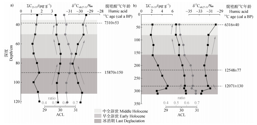 基于Yang等[37]对同一剖面样品测定的腐殖酸14C结果限定年代,结合土壤正构烷烃输入、降解情况以及单体碳同位素指示的古植被变化,可根据指标变化大致划分出年代范围(图 5a,图 5b)。结果显示冰消期ACL和ratio值呈增加趋势,δ13Calk值呈下降趋势;早全新世ACL和ratio值减少,δ13Calk值呈增加趋势;至中全新世ACL和ratio值增加,δ13Calk值呈减少趋势。