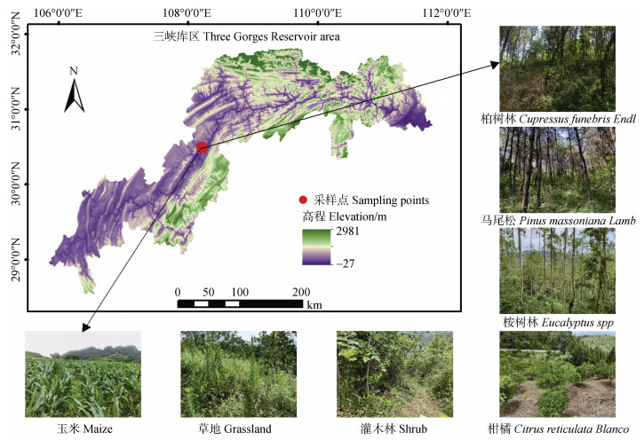 2023年7月在对小流域进行野外详细勘察的基础上,在小流域内选择了库区典型针叶林(柏树和马尾松)、阔叶林(桉树)、柑橘地、灌木地、草地和玉米地共7个样地,基本情况如表 1所示。