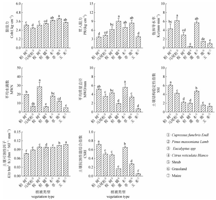 不同植被类型土壤抗蚀性能指标均存在显著差异,但其差异在不同植被类型间没有相对一致的变化规律(图 2)。其主要是因为各抗蚀性能指标与近地表土壤性质和植被特性密切相关(图 3),但不同抗蚀指标的主要影响因素仍存在一定差异。土壤黏结力的变化主要受土壤机械组成和植被枯落物蓄积量等的综合影响,一般情况下,土壤中细颗粒含量越高,枯落物蓄积量越少,受击溅侵蚀影响,土壤越容易板结,导致其黏结力越大[10]。本研究中草地、灌木和玉米地的细颗粒含量相对较高而枯落物蓄积量相对减少(表 2,表 3),导致土壤黏结力相对较高(图 2)。土壤饱和导水率、平均水滴数和平均质量直径主要受土壤孔隙特征、水稳性团聚体和有机质含量的影响[25],本研究中柑橘地和玉米地的总孔隙度、水稳性团聚体含量和有机质含量均较小(表 2),使得柑橘地和玉米地的土壤饱和导水率、平均水滴数和平均质量直径显著小于其他植被类型(图 2)。土壤结构稳定性指数和土壤可蚀性因子主要受土壤机械组成和有机质含量的影响,且SSI随有机质含量的增大而增大,而K随有机质含量的增大而减小[26]。本研究中玉米地的有机质含量最小而柏树地最大,导致柏树地的SSI最大而K最小,玉米地的SSI最小而K最大(图 2)。综上可知,由于不同抗蚀性能指标主要影响因素不同,当采用不同的土壤抗蚀性能指标评估土壤抗蚀性能的时候可能会得到完全不同的结果。因此本研究通过选取前人常用的抗蚀性能指标,计算一个综合抗蚀性能指数,以期全面反映植被类型变化驱动的土壤性质和植被特性变化对土壤抗蚀性能的影响。