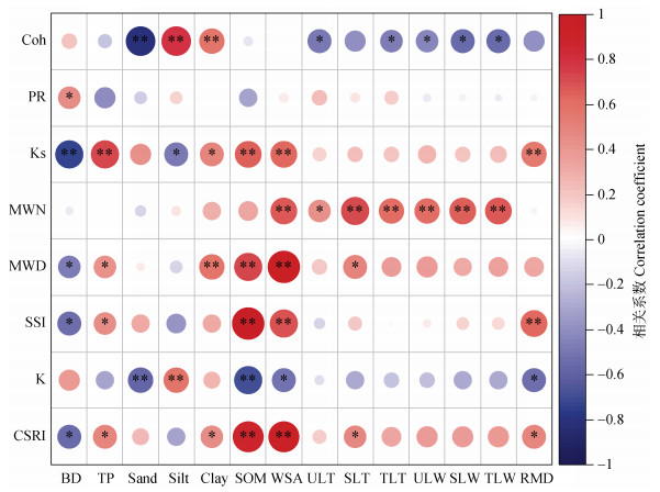 注:Coh为黏结力,PR为贯入阻力,Ks为饱和导水率,MWN为平均水滴数,MWD为平均质量直径,SSI为土壤结构稳定性指数,K为土壤可蚀性因子,CSRI为土壤抗蚀性能综合指数;BD为容重,TP为总孔隙度,Sand为砂粒,Silt为粉粒,Clay为黏粒,SOM为有机质,WSA为水稳性团聚体含量,ULT为未分解枯落物厚度,SLT为半分解枯落物解厚度,TLT为枯落物总厚度,ULW为未分解枯落物蓄积量,SLW为半分解枯落物蓄积量,TLW为枯落物总蓄积量,RMD为根质量密度。下同。* P < 0.05,** P < 0.01。 Note: Coh is soil cohesion, PR is soil penetration resistance, Ks is an saturated conductivity, MWN is mean water number, MWD is mean weight diameter, SSI is soil structural stability index, K is erodibility factor, CSRI is comprehensive soil erosion resistance index; BD is bulk density, TP is total porosity, Sand is sand content, Silt is silt content, Clay is clay content, SOM is soil organic matter content, WSA is water stable aggregate content, ULT is litter thickness of the un-decomposed layer, SLT is litter thickness of semi-decomposed layer, TLT is total litter thickness, ULW is litter weight of the un-decomposed layer, SLW is litter weight of semi-decomposed layer, TLW is total litter weight, RMD is root mass density; The same as below. * P < 0.05, ** P < 0.01. 图 3 土壤抗蚀性能与其影响因素的相关性 Fig. 3 Correlation analysis between soil erosion resistance and its influencing factors |