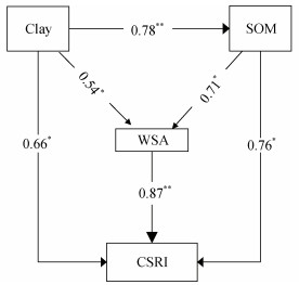 图 5 土壤抗蚀性能综合指数(CSRI)主要影响因素的路径分析 Fig. 5 The path analysis of main influencingfactors of Comprehensive Soil Erosion Resistance Index(CSRI) |