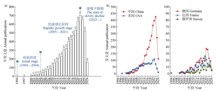 注:2024年数据截至3月31日。 Note:The data of 2024 is up to March 31. 图 2 改性纳米零价铁(M-nZVI)领域年发文量(a)及“桥梁”国家年发文量变化(b) Fig. 2 Annual publications in the field of modified nanoscale zero valent iron (M-nZVI) from 1994 to March 2024 (a) and annual publications of the "bridge" countries from 1994 to March 2024 (b) |