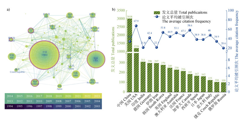 注:节点大小代表文献数量,文献越多,节点越大;节点连线代表了节点间的合作关系;节点紫色圆圈代表该节点中介中心性大于0.1,具有较大的桥梁作用。 Note: The node size corresponds to the volume of publications, with larger nodes indicating a greater number of publications. The connecting lines between nodes represent collaborative relationships. Nodes encircled by purple circles denote a betweenness centrality value exceeding 0.1, signifying their pivotal bridging role in the network. 图 3 国家间合作关系共现图(a)及发文量排名前十五国家的累计发文量及其论文平均被引频次(b) Fig. 3 Collaboration network of countries (a) and total publications and the average citation frequency of the top fifteen countries (b) |