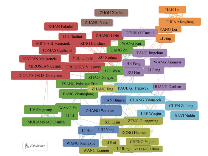 在这些研究群体中,代表性学者包括但不局限于张伟贤(同济大学)、陈祖亮(福建师范大学)、Ravi Naidu(University of Newcastle)、曾光明(湖南大学)、董浩然(湖南大学)、方战强(华南师范大学)、吕树光(华南理工大学)、徐新华(浙江大学)、Gregory V. Lowry(Carnegie Mellon University)、陈梦舫(中国科学院南京土壤研究所)、Denis O’Carroll(University of Western Ontario)等。其中,多数的中国研究者曾经在美国、加拿大、澳大利亚等国家学习或工作,近些年来陆续返回祖国发展,进而推动了我国在该领域的发展水平,出现该现象的原因除科学家的爱国情怀外,还与我国经济快速发展、科研环境逐渐改善和科技实力不断提升有关。就研究领域而言,上述学者的研究领域涉及新材料研发、机理研究、工程应用等各方面,但各有侧重。比如,张伟贤及其团队探索了铁基纳米材料在还原氯代有机物及重金属过程中的优势、机理等[31],陈祖亮团队通过绿色合成技术研发新型M-nZVI材料,对材料合成机制、影响因素进行研究,并将其应用于利福平、米托蒽醌等抗生素以及重金属铅等的去除[32-33]。Gregory V. Lowry和徐新华团队针对M-nZVI在环境中的运移、M-nZVI的生态毒性以及污染物的去除等开展了研究[34-35]。