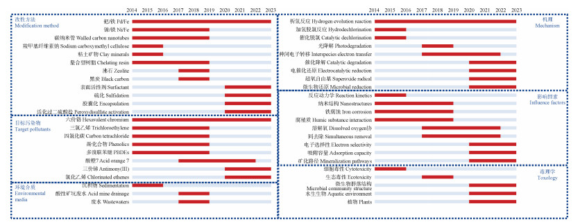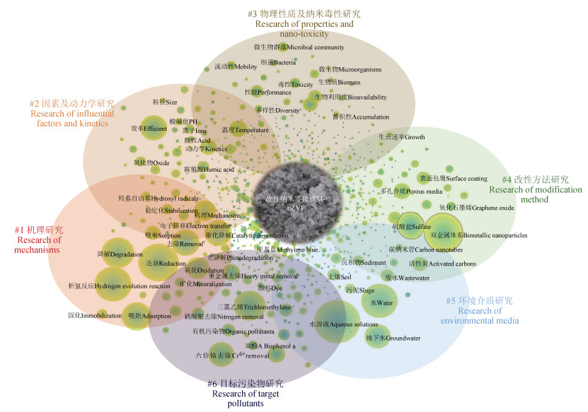 2.3.1 关键词聚类分析聚类分析共获得2014—2023年679个关键词的6个聚类(图 5),分别为聚类1机理研究、聚类2因素及动力学研究,聚类3物理性质及纳米毒性研究、聚类4改性方法研究、聚类5环境介质应用研究和聚类6目标污染物研究。根据高频关键词的数量可判断,6大聚类的重要性由高到低依次为聚类1、聚类5、聚类6、聚类2、聚类4、聚类3。