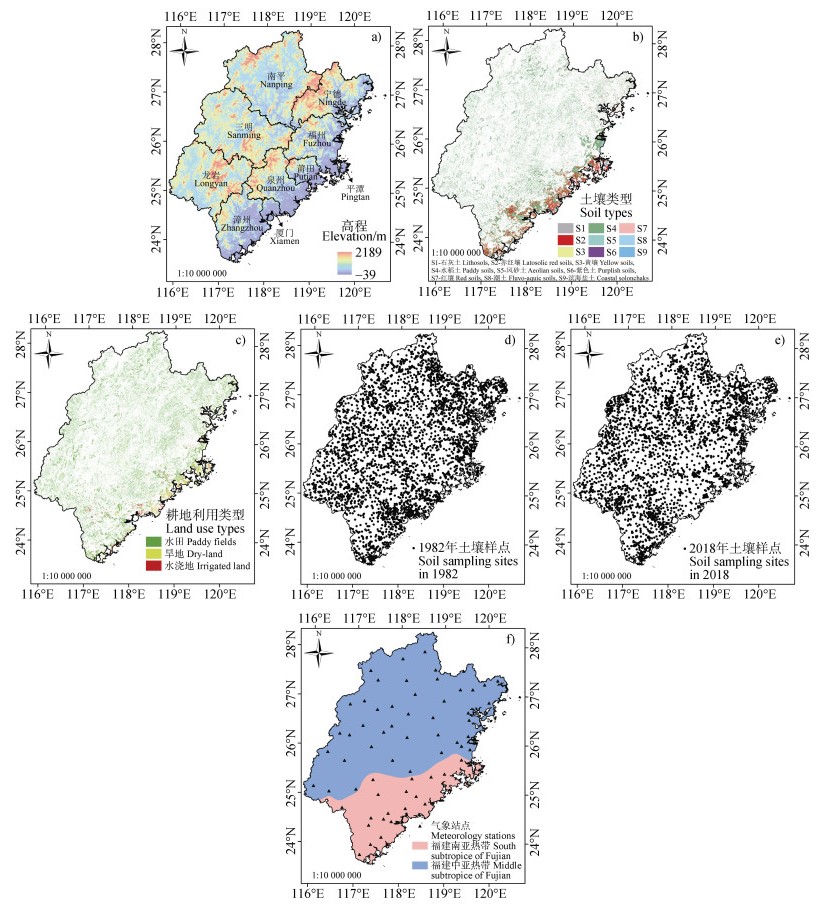 1.7 数据统计与制图本研究的区域差异主要基于行政区(9个设区市及其所处区位-福建东南沿海市域和西北内陆市域)、土壤类型(9个土类)、利用类型(水田、旱地、水浇地)、气候带(福建南亚热带和中亚热带)等角度进行数据统计与制图,其中,平潭综合实验区归并到福州市统计、制图,南平、三明、宁德和龙岩4市按福建西北内陆市域统计,福州、莆田、泉州、厦门和漳州5市按福建东南沿海市域统计。数据库建设及其空间统计与分析、像片图制作均采用ArcGIS v. 10.8软件,数据描述性统计及其柱状图、拆线图等绘制采用Microsoft Excel 2010。