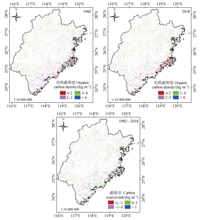 式中,SOCD1982和SOCD2018分别为1982年和2018年土壤有机碳密度。若∆SOCD1982-2018 > 0,耕地土壤为碳汇,否则为碳源。