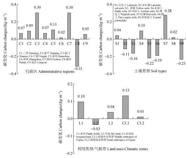 如图 3所示,福建省耕地具有“源”与“汇”双重功能,但不同行政区域、土壤类型、利用类型和气候带在土壤碳源/汇中的贡献差异较大。莆田市耕地总体为碳源,近40年土壤有机碳密度下降了0.31 kg·m−2,其他市域耕地为碳汇,且福州市、厦门市和泉州市有机碳密度上升幅度均超过0.10 kg·m−2。土壤类型以水稻土和红壤的固碳增汇作用最明显,有机碳密度分别上升了0.10 kg·m−2和0.28 kg·m−2,而“碳源”土壤的碳损失强度呈滨海盐土(0.23 kg·m−2) > 风砂土(0.22 kg·m−2) > 紫色土(0.19 kg·m−2) > 黄壤(0.16 kg·m−2) > 赤红壤(0.11 kg·m−2)。水田土壤和福建中亚热带耕地土壤碳汇效应显著,有机碳密度分别上升0.10 kg·m−2和0.13 kg·m−2,单位面积固碳增量明显高于水浇地和福建南亚热带耕地;旱地土壤为碳源,有机碳密度下降0.03 kg·m−2。
